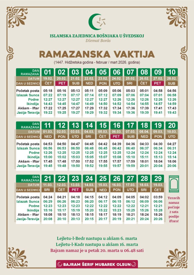 Ovom prilikom obavještavamo vas o ramazanskim aktivnostima. Prvi dan posta – u četvrtak, 19. februaraPrva teravija – srijeda, 18. februar, osim