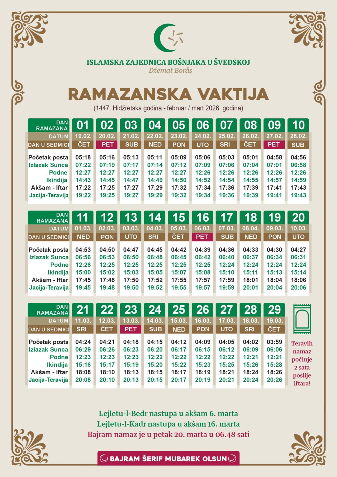 Första tarawih-bönen – onsdag den 18 februari. Förutom den första tarawih-bönen kommer alla övriga att hållas två timmar efter iftar.